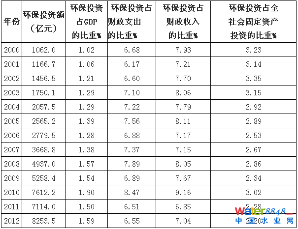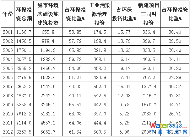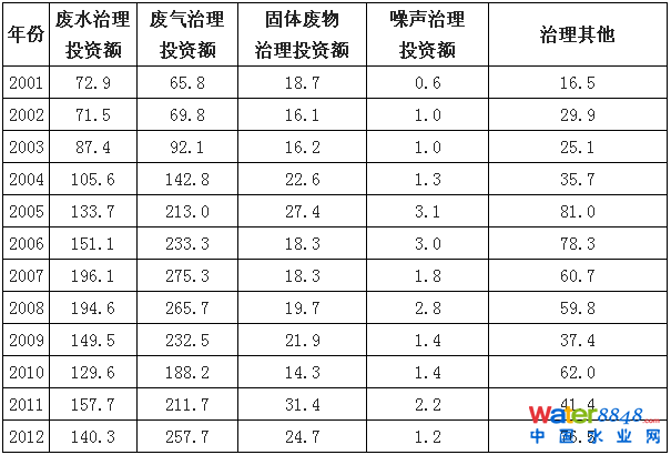 2001-2012年中國(guó)環(huán)保投資結(jié)構(gòu)情況(單位:億元)