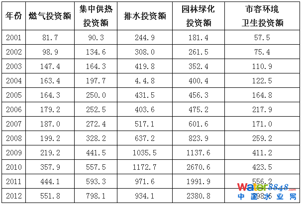 城市環(huán)境基礎(chǔ)設(shè)施建設(shè)投資是環(huán)保投資的重要組成部分,但是目前我國(guó)的環(huán)保設(shè)施運(yùn)行效率不容樂觀。我國(guó)的城市環(huán)境基礎(chǔ)設(shè)施建設(shè)投資在供熱、排水、園林綠化方面相對(duì)較多,在燃?xì)狻⒐、排水、園林綠化和市容環(huán)境衛(wèi)生五個(gè)方面都呈逐年上升態(tài)勢(shì),尤其是園林綠化方面,投資額由2001年的181.4億元增長(zhǎng)到2012年的2380.8億元,增長(zhǎng)了13倍,燃?xì)馔顿Y額增長(zhǎng)了7倍,供熱方面增長(zhǎng)了近9倍,排水投資額增長(zhǎng)了近4倍,市容環(huán)境衛(wèi)生投資方面增長(zhǎng)了7倍。