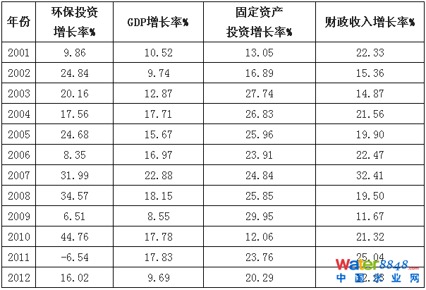 2001-2012 年中國(guó)環(huán)保投資增長(zhǎng)、國(guó)民經(jīng)濟(jì)增長(zhǎng)情況(單位%)