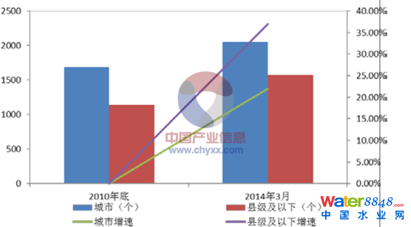從目前污水處理規(guī)模和污水處理率來看,截止2014年3月,在設(shè)市城市中,累計建成污水處理廠2051座,形成處理能力1.26億立方米/日。在縣級及以下鄉(xiāng)鎮(zhèn),累計建成污水處理廠1571座,形成處理能力2758萬立方米/日?梢钥闯鋈珖髦饕痪城市和地級市的污水處理規(guī)模較大、污水處理率較高,未來不會有太多的大型污水處理廠(10萬噸/日以上)的新建需求,而縣城的污水處理廠數(shù)量和處理能力仍然較低,并且更多的是中小型污水處理廠,所以未來在縣級、鎮(zhèn)和鄉(xiāng)等行政單位將會有污水處理廠的新建需求,污水處理的總體規(guī)模仍然有進(jìn)一步提升的空間。