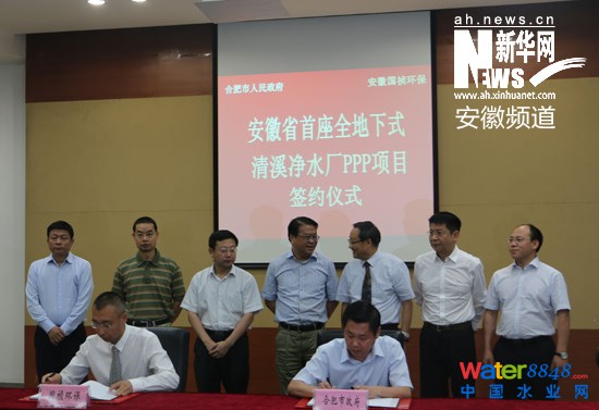 新華網(wǎng)合肥7月9日電 7月9日上午11點(diǎn),安徽省首座全地下室污水處理廠——清溪凈水廠PPP項(xiàng)目簽約儀式在合肥市政府18號(hào)會(huì)議室舉行。合肥市委副書記、市長(zhǎng)張慶軍,市委常委、副市長(zhǎng)周善武,安徽國(guó)禎集團(tuán)董事局主席李煒等人出席儀式。此次簽約,標(biāo)志著安徽省首座全地下室污水處理廠PPP項(xiàng)目融資,建設(shè)工作正式拉開序幕。