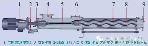 在污泥泵送系統(tǒng)中通常采用偏心螺桿泵,其主要工作部件是偏心螺桿(轉(zhuǎn)子)和螺桿村套(定子)。當電動機帶動泵軸轉(zhuǎn)動時,螺桿一方面繞自身的軸線旋轉(zhuǎn),另一方面又沿襯套內(nèi)表面滾動,于是形成泵的密封腔,螺桿每旋轉(zhuǎn)1周,密封腔內(nèi)的污泥就向前推進1個螺距,隨著螺、桿的連續(xù)轉(zhuǎn)動,被輸送的污泥以螺旋形式從一個密封腔壓向另一個密封腔,最后擠出泵體。泵的易損件定子和轉(zhuǎn)子通常每2個月到半年更換一次。