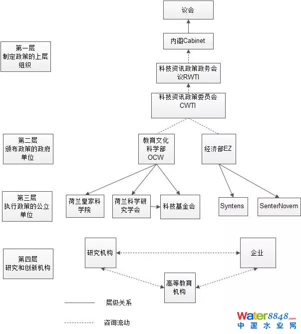 20世紀(jì)70年代,迎來了厭氧生物技術(shù)發(fā)展的第二個高潮。隨著經(jīng)濟(jì)的快速發(fā)展,世界能源危機(jī)和環(huán)境污染問題越來越突出?茖W(xué)家們開發(fā)了以UASB反應(yīng)器(荷蘭)為代表的第二代厭氧反應(yīng)器,該反應(yīng)器可將污泥停留時間與水力停留時間分離,處理高濃度廢水的停留時間從過去的二三十天可縮短到幾小時或幾天,使得厭氧生物處理技術(shù)開始迅速發(fā)展和廣泛應(yīng)用。從世界范圍來看,南非在20世紀(jì)50-60年代就采用了厭氧技術(shù)處理高濃度工業(yè)廢水,以及20世紀(jì)60年代美國的McCarty小組就厭氧濾池的研究均在厭氧技術(shù)發(fā)展中實現(xiàn)了突破性的研究,但并沒有得到政府和業(yè)界的支持和認(rèn)可。而在荷蘭,厭氧生物技術(shù)先后在處理農(nóng)產(chǎn)品工業(yè)廢水、林產(chǎn)品制造業(yè)和造紙工業(yè)廢水處理、高含鹽廢水、化工和石化工業(yè)廢水等方面取得了成功。荷蘭瓦格寧根(Wageningen)農(nóng)業(yè)大學(xué)的lettinga教授的科研成果在厭氧技術(shù)發(fā)展史上具有劃時代的意義。1970年,lettinga教授等人首次進(jìn)行了厭氧研究,70年代初,進(jìn)行了制糖和土豆淀粉廢水的小試和中試。1976年,他們在荷蘭Halfweg的CSM工廠建造了200m3的示范上流式厭氧污泥床反應(yīng)器(Up-flow Anaerobic Sludge Bed,簡稱UASB),次年1000m3規(guī)模的UASB反應(yīng)器投入運(yùn)行。1985年,荷蘭帕克(Paques)公司發(fā)明了厭氧內(nèi)循環(huán)反應(yīng)器(Internal Circulation Reactor,簡稱IC),與百歐仕(Biothane)以及其他咨詢公司成功開拓了厭氧技術(shù)的國際市場。1986年,lettinga等人發(fā)明了第三代高效厭氧反應(yīng)器——膨脹顆粒污泥床(Expanded Granular Sludge Bed,簡稱EGSB)反應(yīng)器。在20世紀(jì)80年代和90年代,UASB反應(yīng)器已經(jīng)成為厭氧工藝的主流,到1999年國內(nèi)外所建立的厭氧工藝中UASB反應(yīng)器約占全部項目的59%。從90年代開始,EGSB反應(yīng)器得到應(yīng)用,目前EGSB反應(yīng)器占新建項目的50%。lettinga教授認(rèn)為厭氧生物技術(shù)在荷蘭獲得成功的原因主要有:市場需求以及與工業(yè)界的良好合作、荷蘭政府的科研及創(chuàng)新體系以及相關(guān)政策、跨領(lǐng)域科學(xué)家的良好合作。荷蘭政府的具體措施是值得我們深入研究的。荷蘭的科研和創(chuàng)新系統(tǒng)主要分為四個層面,如下圖1: