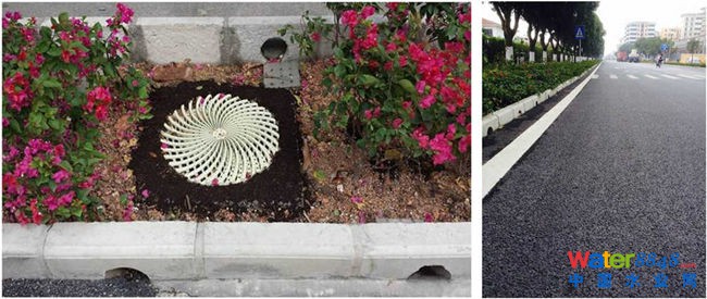 (2)隔離帶:下沉式綠地,自然滲透以外的部分通過雨水篦子進入調蓄系統(tǒng)。