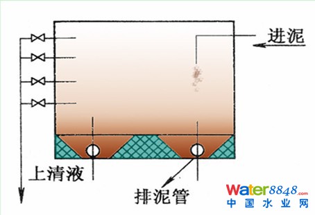 間歇式重力濃縮池工作時(shí).先將污泥充滿(mǎn)全池,經(jīng)靜置沉降、濃縮壓密,池內(nèi)將分為上清液、沉降區(qū)和污泥層,定期從側(cè)面分層導(dǎo)流管排出上清液,導(dǎo)流管的位置可隨污泥固體物質(zhì)的沉淀不斷下降,直至污泥不再繼續(xù)濃縮。然后,濃縮污泥由泵從漏斗中吸出以備后續(xù)處理和處置。間歇式濃縮池主要用于污泥量小的處理系統(tǒng)。濃縮池一般不少于兩個(gè),一個(gè)工作,另一個(gè)進(jìn)入污泥,兩池交替使用。