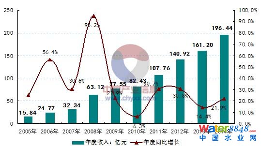 中國(guó)產(chǎn)業(yè)信息網(wǎng)發(fā)布的《2015-2020年中國(guó)環(huán)境監(jiān)測(cè)市場(chǎng)供需預(yù)測(cè)及市場(chǎng)專(zhuān)項(xiàng)調(diào)研報(bào)告》指出:中國(guó)環(huán)境監(jiān)測(cè)儀器行業(yè)的銷(xiāo)售收入逐年增加,由2005年的15.84億元上升為2014年的196.44億元。近幾年我國(guó)環(huán)境監(jiān)測(cè)儀器行業(yè)的銷(xiāo)售收入情況如下圖所示: