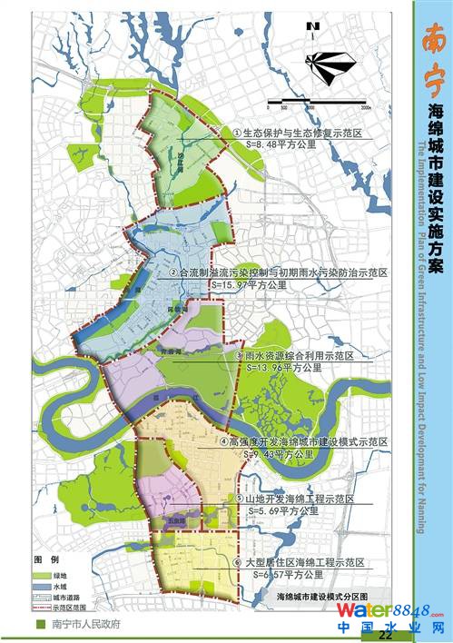 根據(jù)示范區(qū)現(xiàn)狀和規(guī)劃情況以及海綿城市建設(shè)的側(cè)重點,南寧市將示范區(qū)劃分為6個片區(qū),分別為:生態(tài)保護(hù)與生態(tài)修復(fù)示范區(qū)、合流制溢流污染控制與初期雨水污染防治示范區(qū)、雨水資源綜合利用示范區(qū)、高強(qiáng)度開發(fā)海綿城市建設(shè)模式示范區(qū)、山地開發(fā)海綿工程示范區(qū)和大型居住區(qū)海綿工程建設(shè)示范區(qū)。針對每個片區(qū)的特點,南寧市將因地制宜地安排各類低影響開發(fā)設(shè)施,探索不同的海綿城市建設(shè)模式和實施路徑。