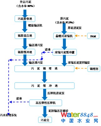 上海天山污水處理廠污泥深度脫水工程設(shè)計規(guī)模為干污泥量13tDS/d,總投資約為2600萬元。主要流程為離心濃縮+藥劑調(diào)理+隔膜壓濾機脫水,它將污 泥含水率降至60%以下,滿足運送至填埋場處置的要求。該工程的建設(shè)是為了保障近期上海市中心城區(qū)污水處理廠污泥的出路,并通過建設(shè)高標準除臭工程改善周邊大氣環(huán)境質(zhì)量。