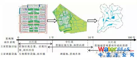 圖1不同尺度雨水系統(tǒng)中調(diào)蓄設(shè)施構(gòu)成的城市雨洪調(diào)蓄系統(tǒng)概化示意
