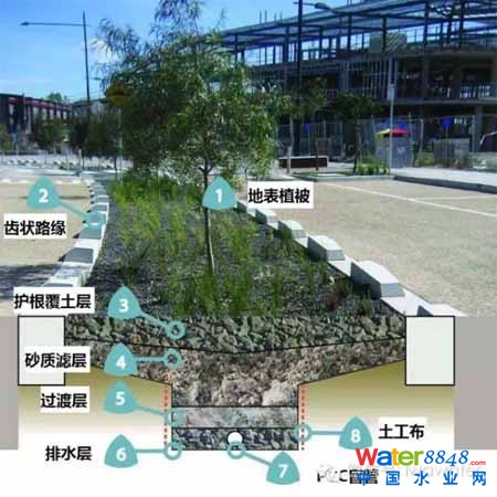 低影響開發(fā)理念和方法在我國已得到廣泛認(rèn)同,生態(tài)化的源頭調(diào)蓄設(shè)施也開始被人們接受,不再局限于末端、大型和傳統(tǒng)的灰色設(shè)施。最典型的如生物滯留設(shè)施,是一種典型的具有生物(態(tài))功能的源頭“微型”儲蓄設(shè)施。它其實是對傳統(tǒng)意義的“儲蓄”的一種延伸。以削減徑流排放總量和控制中小降雨事件徑流水質(zhì)為主要目標(biāo),根據(jù)設(shè)施外觀、景觀功能、建造位置等,一般分為雨水花園、種植池、滯留帶和樹池四種。事實上,這類設(shè)施以往并未被人們當(dāng)作調(diào)蓄設(shè)施,更多視它們?yōu)橐活悵B透設(shè)施。本文將它作為一種調(diào)蓄設(shè)施來討論的理由是:第一,這些設(shè)施同樣具有一定的調(diào)蓄能力,即具有一定的、分散式的調(diào)蓄容積,從英文的生物滯留(bio-retention)及這些設(shè)施的容積計算方法也可以看出;第二,源頭調(diào)蓄設(shè)施已在相關(guān)規(guī)范標(biāo)準(zhǔn)和技術(shù)指南中體現(xiàn),如新編《城市雨水調(diào)蓄工程技術(shù)規(guī)范》中明確寫出“城市雨水調(diào)蓄工程應(yīng)采用低影響開發(fā)理念”,并具體體現(xiàn)在源頭措施中;新發(fā)布的《海綿城市建設(shè)技術(shù)指南》中也涉及用于不同尺度的多種調(diào)蓄設(shè)施。