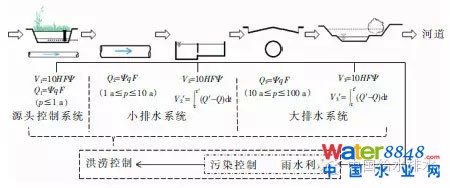 例如(參見圖2),在不改變傳統(tǒng)小排水管道系統(tǒng)標(biāo)準(zhǔn)和能力的情況下(一定的管渠設(shè)計流量Q2及調(diào)節(jié)設(shè)施規(guī)模V2′),通過源頭控制系統(tǒng)中的調(diào)蓄容積V1作用,根據(jù)項目條件的不同,可相應(yīng)將原小排水系統(tǒng)的能力提高到不同的設(shè)計標(biāo)準(zhǔn);在整個系統(tǒng)中,為實現(xiàn)總量控制目標(biāo)的V1、V2、V3的布局及規(guī)模分配也會直接影響控制效果及投資效益。毫無疑問,在規(guī)劃設(shè)計時應(yīng)進行多方案比較,有條件時可采用模型模擬手段。