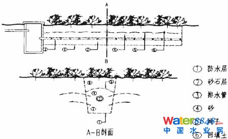 大部分雨水在收集時同時進行土壤滲濾凈化,并通過穿孔管將收集的雨水排入次級凈化池或貯存在滲濾池中;來不及通過土壤滲濾的表層水經(jīng)過水生植物初步過濾后排入初級凈化池中。