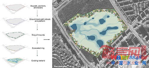 2、中觀——城鎮(zhèn)海綿系統(tǒng),案例:六盤水 六盤水是一個(gè)在20世紀(jì)60年代中期建立起來的工業(yè)城市,城市被石灰?guī)r的山丘環(huán)抱,水城河穿城而過。城市人口密集,在60km2的土地上,居住了約60萬的人口。六盤水市的水生態(tài)綜合治理旨在減緩來自山坡的水流,建造一個(gè)以水過程為核心的生態(tài)基礎(chǔ)設(shè)施來存蓄和凈化雨水,使水成為重建健康生態(tài)系統(tǒng)的活化劑,提供自然和文化服務(wù)使這個(gè)工業(yè)城市變?yōu)橐司映鞘小?/span> 為了構(gòu)建完整的城鎮(zhèn)海綿系統(tǒng),工程關(guān)注水城河流域和城市兩個(gè)層面。首先,河流串聯(lián)起現(xiàn)存的溪流、濕地和低洼地,形成一系列蓄水池和具有不同凈化能力的濕地,構(gòu)建了雨洪管理和生態(tài)凈化系統(tǒng)。這一方法不僅最大限度的減少了城市雨澇災(zāi)害,而且在旱季也能有持續(xù)不斷的水源。第二,拆除渠化河流的混凝土河堤,重建自然河岸的濕地系統(tǒng),發(fā)揮河流的自凈能力。第三,建立連續(xù)開放空間,建立人行道和自行車道系統(tǒng),增加通往濱水的通道。最后,項(xiàng)目將濱水區(qū)開發(fā)和河道整治結(jié)合在一起。以水為核心的生態(tài)基礎(chǔ)設(shè)施促進(jìn)了六盤水的城市改造,提高了城市土地的價(jià)值,增進(jìn)了城市活力。 圖6 六盤水城市海綿系統(tǒng) 圖7 六盤水城市海綿:明湖濕地建成實(shí)景 3、微觀:城市雨洪管理綠色海綿技術(shù),案例:哈爾濱群力雨洪公園 如上所述,“海綿城市”真正在微觀尺度的建設(shè)依靠的是一系列的水生態(tài)基礎(chǔ)設(shè)施建設(shè)技術(shù),限于篇幅在此選擇較為有代表的“城市雨洪管理綠色海綿技術(shù)”來進(jìn)行說明。 哈爾濱群力雨洪公園(群力國(guó)家濕地公園,34公頃)是我國(guó)首個(gè)以解決城市內(nèi)澇為目標(biāo)的國(guó)家級(jí)城市濕地公園。該公園通過整體景觀設(shè)計(jì)途徑進(jìn)行生態(tài)化的雨洪管理,解決常規(guī)市政工程所沒能解決的問題,使我們的城市成為與水問題相適應(yīng)的城市。從2011年建成以來,有效發(fā)揮了其解決城市雨澇的功能。設(shè)計(jì)中關(guān)鍵性技術(shù)要點(diǎn)包括:1)以雨洪安全格局為基礎(chǔ),劃定由“集水城區(qū)-匯水濕地”組成的、具有鑲套式結(jié)構(gòu)的“綠色海綿綜合體”;2)填-挖技術(shù)形成“海綿地形”。一方面是創(chuàng)造多級(jí)濕地系統(tǒng)的地形基礎(chǔ),同時(shí)為下一步營(yíng)造多樣化的生物棲息地與游憩空間提供環(huán)境基礎(chǔ);而且,造價(jià)低廉;3)構(gòu)建“水質(zhì)凈化-蓄滯水-地下水回補(bǔ)”多級(jí)多功能濕地系統(tǒng)。該多級(jí)濕地系統(tǒng)主要是整合潛流和表流濕地技術(shù),進(jìn)行土壤和生物凈化,將凈化后的雨水匯入中央低洼濕地,補(bǔ)充地下水。按照“水質(zhì)凈化人工濕地-蓄滯人工濕地-地下水回補(bǔ)與生物多樣性恢復(fù)濕地”這一順序,依次構(gòu)造三類濕地系統(tǒng),產(chǎn)生多種生態(tài)系統(tǒng)服務(wù)。4)充分利用地形及水量分布特征實(shí)施特色生境修復(fù),并與鄉(xiāng)土生物保護(hù)、游憩與科普教育功能相融合。 圖8 城市海綿體:哈爾濱群力雨洪公園總平面圖 圖9 城市海綿體:哈爾濱群力雨洪公園建成實(shí)景 四、結(jié)語 本文要探討了關(guān)于如何科學(xué)、系統(tǒng)地對(duì)待水的問題,提出建立水生態(tài)基礎(chǔ)設(shè)施是生態(tài)治水的核心,也是實(shí)現(xiàn)“海綿城市”的關(guān)鍵。國(guó)家高層對(duì)“海綿城市”的重視是改變城市規(guī)劃建設(shè)理念的重大契機(jī)。圍繞這一概念,社會(huì)各界通過廣泛的討論來關(guān)注城市洪澇問題和一系列相關(guān)的生態(tài)和環(huán)境問題,重新審視工業(yè)時(shí)代治水思路的利弊,深刻認(rèn)識(shí)生態(tài)雨洪管理和城市生態(tài)建設(shè)的重要性及方法和技術(shù),對(duì)實(shí)現(xiàn)生態(tài)文明和美麗中國(guó)具有重要意義,學(xué)術(shù)界應(yīng)該給與充分的重視。 我結(jié)合多年來經(jīng)驗(yàn),提出“海綿城市”建設(shè)浪潮應(yīng)該推動(dòng)以下幾方面學(xué)術(shù)研究:1)中國(guó)古代水適應(yīng)性城鄉(xiāng)發(fā)展的思想、工程與技術(shù)遺產(chǎn)的整理和研究,目前這方面的研究還非常有限,不論從城市規(guī)劃、水利建設(shè)角度還是從遺產(chǎn)保護(hù)角度出發(fā),都應(yīng)該加快對(duì)該類水適應(yīng)性景觀和技術(shù)遺產(chǎn)的整理和研究;2)綠色基礎(chǔ)設(shè)施與灰色基礎(chǔ)設(shè)施相銜接的研究,中國(guó)城市建設(shè)已經(jīng)形成了對(duì)灰色基礎(chǔ)設(shè)施的依賴,如何逐步擺脫這種依賴,有效的促進(jìn)綠色基礎(chǔ)設(shè)施優(yōu)先的城市雨洪調(diào)蓄系統(tǒng)、如何在實(shí)際管理和操作層面實(shí)現(xiàn)這種銜接依舊是難題。3)水生態(tài)基礎(chǔ)設(shè)施規(guī)劃落實(shí)的法治化途徑,推進(jìn)各尺度水生態(tài)基礎(chǔ)設(shè)施的實(shí)施納入法定規(guī)劃體系,將規(guī)劃成果廣泛征求各部門和利益相關(guān)者的意見,通過多方博弈最終確定其空間邊界,比如“水生態(tài)紅線”; 4)一系列相關(guān)技術(shù)指南的制定,不同尺度水生