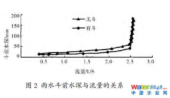 從圖2雨水斗前水深與流量的關系可以看出:在流量較小時,在有斗和無斗情況下斗前水深相同,隨著流量增加,無雨水斗的排水系統(tǒng)斗前水深高于有雨水斗的斗前水深,最后流量達到一定數(shù)值,無雨水斗系統(tǒng)不再產(chǎn)生渦流,兩者斗前積水深度相同。這是因為流量較小時,都為重力式排水,水深相同;積水深度增加超過雨水斗高度時,雨水斗防渦流,產(chǎn)生虹吸效應,加快了雨水排除;到最后積水深度高出雨水斗一定范圍,無論有無雨水斗都沒有空氣進入排水系統(tǒng),兩種系統(tǒng)的排水能力相同。