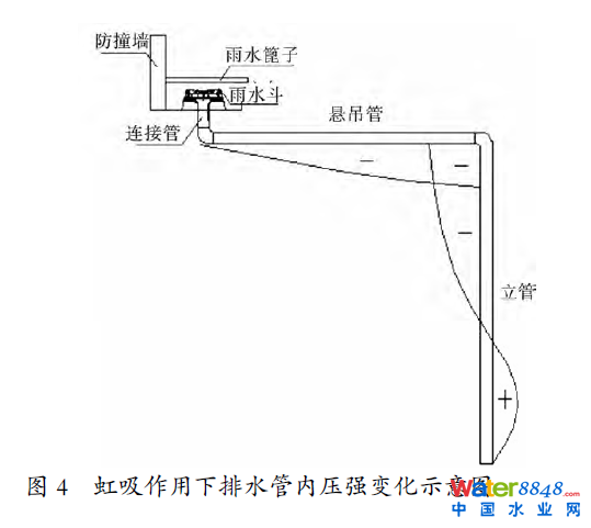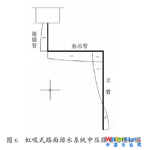圖6虹吸式路面排水系統(tǒng)中壓強變化模擬圖中筆者認為發(fā)生虹吸作用時由于雨水斗的氣水分離作用,在連接管上下部均有一定負壓,這是由于無空氣從上部進入,同時雨水將上部空氣排走的結果。懸吊管負壓應呈曲線變化,因為雨水受重力和沿程水頭損失共同作用。立管下部出口與外界大氣相連,此處應該為大氣壓強。