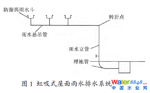 虹吸式屋面雨水排水系統(tǒng)的工作原理是:在降雨初期,屋面積水深度未超過雨水斗高度,整個排水系統(tǒng)工作狀態(tài)與重力排水系統(tǒng)相同。隨著屋面積水深度的增加,當積水深度超過雨水斗高度時,由于防漩渦雨水斗能極大地減少雨水進入排水系統(tǒng)時所夾帶的空氣量,從而使雨水滿管流動時產(chǎn)生虹吸作用,在懸吊管轉入立管處管道處產(chǎn)生最大負壓,屋面雨水在管內(nèi)負壓的抽吸作用下以較高的流速被排至室外。圖1為虹吸式屋面雨水排水系統(tǒng)圖,系統(tǒng)由天溝、雨水斗收集,經(jīng)懸吊管、立管、埋地管排入雨水管網(wǎng)。