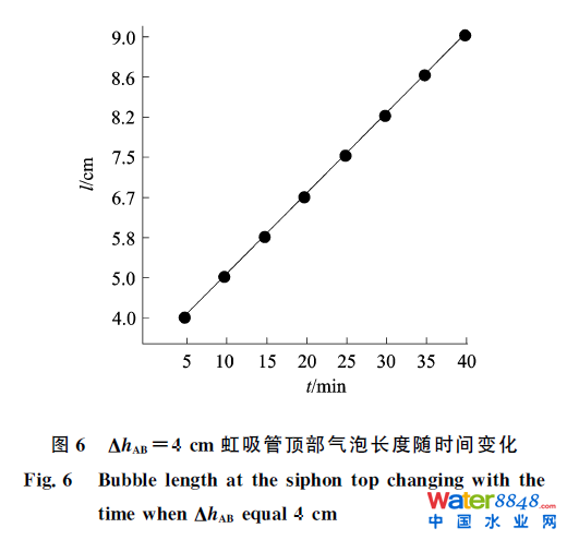 8mm直徑虹吸管試驗(yàn)開始的水頭差取為20cm,利用虹吸作用使水桶A 的水逐漸流入水桶 B, ΔhAB逐漸減小。在開始階段 ΔhAB較大,虹吸流速較快,盡管虹吸管中產(chǎn)生微小氣泡,但由于小氣泡的上升速度較慢,它們均受水流推動(dòng)進(jìn)入到水桶B中,氣泡不在 虹吸 管 內(nèi)積 累;隨著虹吸過程的發(fā)展,ΔhAB下降到10cm 后,可見大量小氣泡在出水管內(nèi)停留,并在虹吸管頂點(diǎn)附近出現(xiàn)一個(gè)直徑約3mm的大氣泡;ΔhAB降到8cm后,虹吸管頂點(diǎn)附近出現(xiàn)的大氣泡已經(jīng)基本占滿整個(gè)虹吸管,并受水流推動(dòng)緩慢下移;當(dāng)其接近到達(dá)水桶 B 時(shí),ΔhAB下降到5cm,虹吸過程繼續(xù),但氣泡停止下移,并在經(jīng)歷短暫的停留后,在浮力作用下反水流方向緩慢上升,氣泡呈彈狀,長(zhǎng)約4cm;ΔhAB下降到4cm后,氣泡上升速度明顯加快,不同直徑的氣泡逐漸在虹吸管頂點(diǎn)附近集聚;保持 ΔhAB為4cm,虹吸管頂點(diǎn)附近的氣泡長(zhǎng)度隨時(shí)間逐漸增長(zhǎng),變化過程見圖6,氣泡長(zhǎng)度(l)隨時(shí)間(t)近于線性增長(zhǎng);之后不再保持 ΔhAB,使其在虹吸過程中逐漸接近于0,虹吸水流最后停止;再經(jīng)歷24h后,虹吸管內(nèi)所有氣泡全部上升到虹吸管的頂點(diǎn)附近,氣泡段長(zhǎng)度達(dá)到了30cm。由此可見,當(dāng)虹吸管直徑達(dá)到8mm時(shí),在低水頭差的邊坡虹吸排水過程中,會(huì)發(fā)生管內(nèi)氣泡的積累,無(wú)法形成穩(wěn)定的彈狀流,最終將破壞虹吸過程。