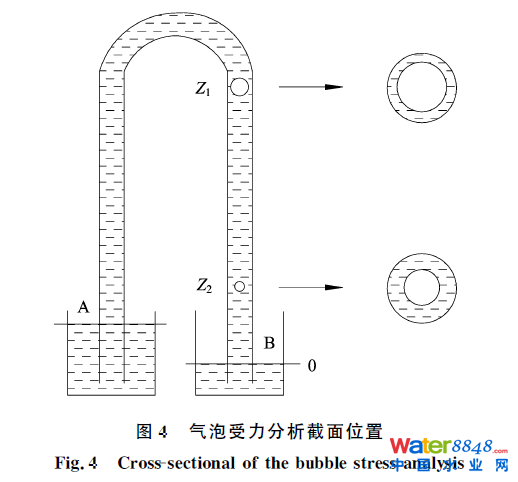受壓力變化的影響,氣泡沿虹吸管向下流動(dòng)的過程中,體積逐漸減小,相應(yīng)的向下運(yùn)動(dòng)速度也逐漸減小。如圖4所示,假定Z1高度處有一直徑為6mm 的氣泡在隨水流向下移動(dòng)的過程中,一方面因?yàn)閴毫υ黾佣箽馀莸捏w積減小,另一方面又因?yàn)榕c其他氣泡兼并而使其體積增大。氣泡在低壓力區(qū)域形成后,隨管內(nèi)的水流向下流動(dòng),由于氣泡的體積(V)與氣壓相關(guān),有