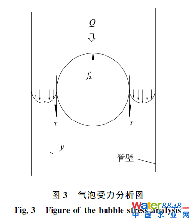 對(duì)于虹吸管流,引起氣泡運(yùn)動(dòng)速度差異更重要的因素,還在于不同大小氣泡受到的水流推力的差異。管中氣泡的受力特征如圖3所示,包括氣泡的上浮力fa、水流Q在氣泡上下水頭損失引起的壓力差 Δp 及其沿氣泡和管壁間流動(dòng)引起的切應(yīng)力τ?紤]層流的情況,τ可用牛頓內(nèi)摩擦定律表達(dá):