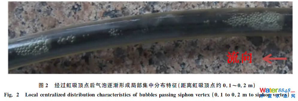 1)以進(jìn)水管的水面為基準(zhǔn),距基準(zhǔn)面垂直高度3.5m處,虹吸管內(nèi)開始明顯有氣泡產(chǎn)生,且數(shù)量較多,直徑小,最大直徑小于0.5mm。