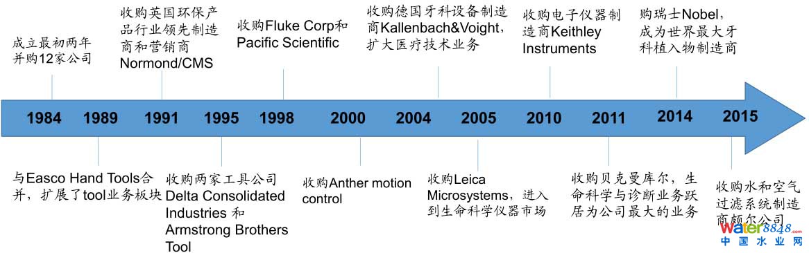 丹納赫的發(fā)展史就是一部并購史,不斷進(jìn)行橫向/相關(guān)、縱向并購,獲得新技術(shù),打造豐富的產(chǎn)品線,成為全球領(lǐng)先的科技創(chuàng)新產(chǎn)品與服務(wù)的設(shè)計商及制造商,主營測試與計量、環(huán)境、牙科、生命科學(xué)與診斷、工業(yè)科技這5個業(yè)務(wù)板塊。丹納赫從1986年到2014年,公司收購企業(yè)達(dá)400多家,通過不斷的并購,營業(yè)額從1988年的7億美金增長到200億美金,位列世界500強(qiáng)的第149位,總市值高達(dá)580多億美金,其股價在30年間上漲700多倍。