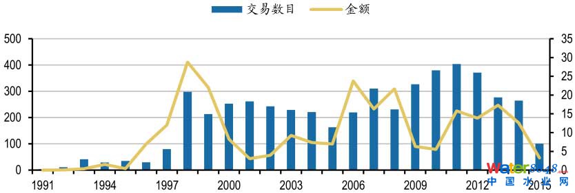 環(huán)保行業(yè)并購數(shù)量及金額(十億美元)