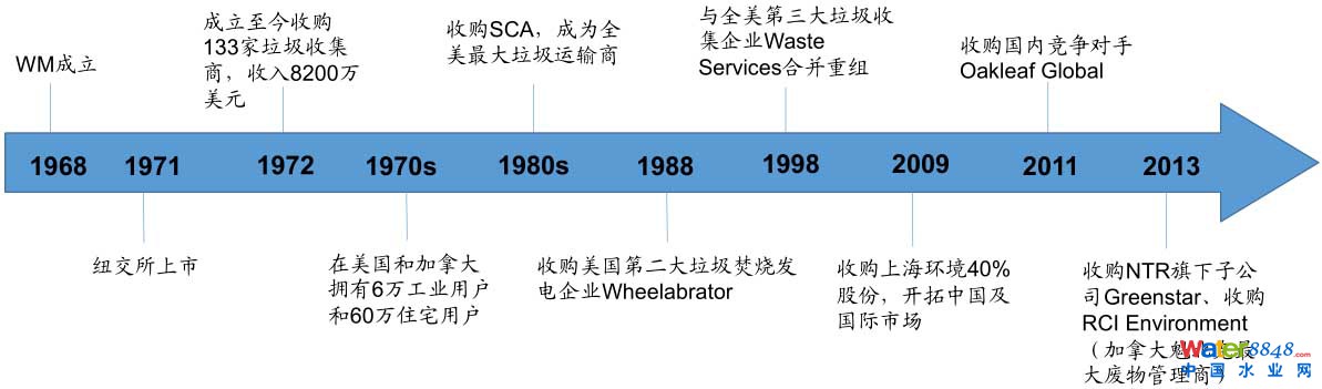 WM成立于1968年,1971年上市,立足于固廢處理產(chǎn)業(yè),依次并購垃圾收集、垃圾運(yùn)輸、垃圾發(fā)電等企業(yè),并于1988年收購美國第二大垃圾焚燒發(fā)電企業(yè)Wheelabrator;1998年公司與全美第三大垃圾收集企業(yè)USAWasteService合并。WM和共和服務(wù)公司占據(jù)全美50%以上的垃圾收運(yùn)市場。2009年收購了上海城投旗下全資子公司上海環(huán)境集團(tuán)有限公40%的股份,以尋求開拓中國市場和國際市場。2011年收購OakleafGlobal;2013年收購NTR旗下子公司Greenstar、收購RCIEnvironment(加拿大魁北克最大廢物管理商)。WM通過一系列的收購成就了全球固廢巨頭的地位,其股價在1988年到1998年10年間上漲20倍。