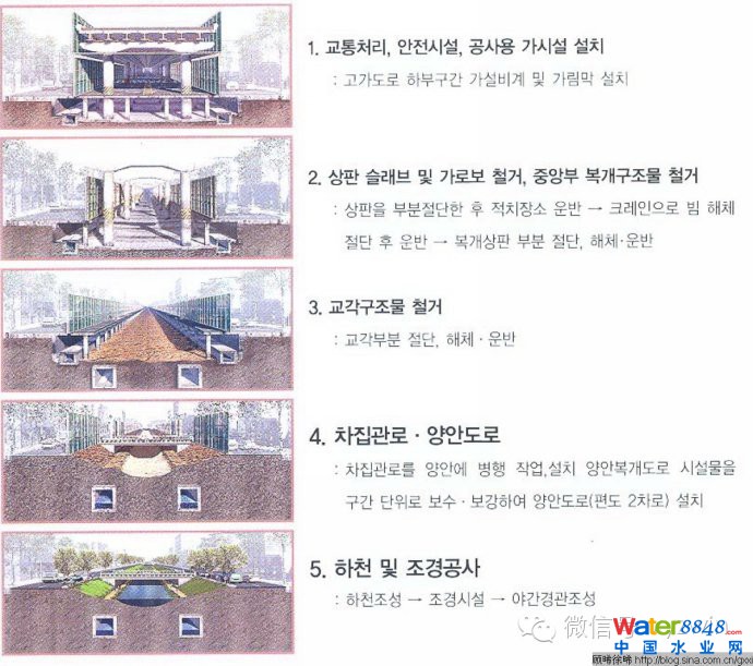 整個工程歷時兩年多,拆除了5.8km的清溪川路和高架橋,修建了濱水生態(tài)景觀及休閑游憩空間,耗資3800億韓元(折合約3.6億美元),于2005年10月竣工。工程細分為拆除建筑物、復興改造河流、保障用水供應、維修下水道、建設兩側及附近道路等,包括了排水供水、橋梁建設、照明、景觀、歷史文化遺跡復原等22個小工程。