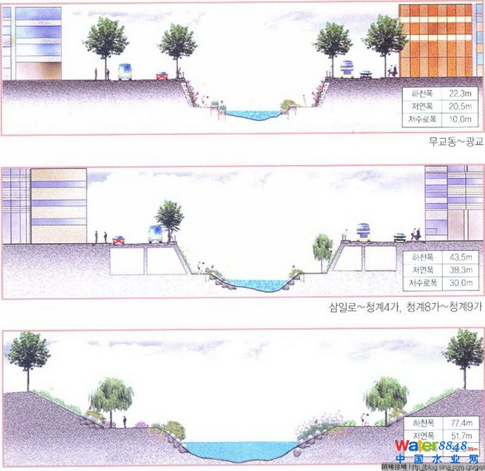 充分考慮清溪川所屬區(qū)位的特點,根據(jù)各河段所處區(qū)域的經(jīng)濟社會狀況和功能需求,結合自然形態(tài),在不同的河段上采取不同的規(guī)劃方式。