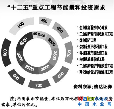工業(yè)節(jié)能市場(chǎng)潛力最大!豆I(yè)節(jié)能“十二五”規(guī)劃》提出:到2015年規(guī)模以上工業(yè)增加值能耗比2010年下降21%左右,預(yù)計(jì)實(shí)現(xiàn)節(jié)能6.7億噸標(biāo)煤,并明確重點(diǎn)行業(yè)單位工業(yè)增加值能耗下降值,如鋼鐵、有色金屬、機(jī)械行業(yè)分別下降18%、18%和22%。同時(shí)組織實(shí)施工業(yè)鍋爐窯爐節(jié)能改造、電機(jī)系統(tǒng)節(jié)能改造、余熱余壓回收利用、熱電聯(lián)產(chǎn)等九大重點(diǎn)節(jié)能工程,重點(diǎn)工程投資需求5900億元,預(yù)計(jì)實(shí)現(xiàn)節(jié)能2.39億噸標(biāo)煤。