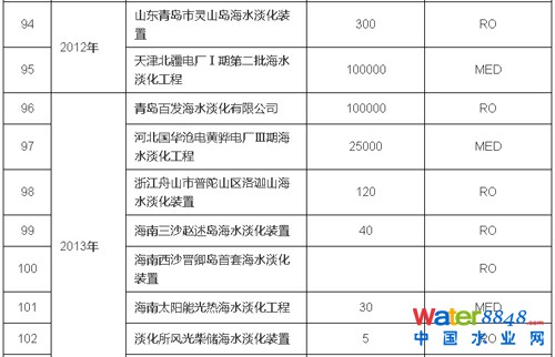 截止2014年底,全國(guó)已建成萬(wàn)噸級(jí)以上海水淡化工程27個(gè),產(chǎn)水規(guī)模812800噸/日;千噸級(jí)以上、萬(wàn)噸級(jí)以下海水淡化工程34個(gè),產(chǎn)水規(guī)模104500噸/日;千噸級(jí)以下海水淡化工程51個(gè),產(chǎn)水規(guī)模9605噸/日。最大海水淡化工程規(guī)模為20萬(wàn)噸/日。下表為全國(guó)沿海已建成的海水淡化工程統(tǒng)計(jì)。