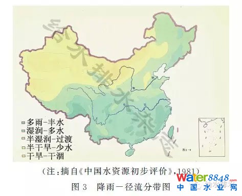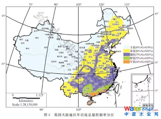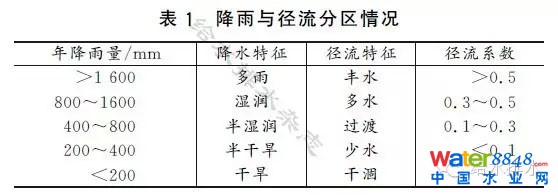 徑流系數(shù)是表征水文特征的重要參數(shù),是自然狀態(tài)下地表徑流量與總降雨量的比值,與自然地理氣候狀況有直接關(guān)系。依據(jù)多年水文氣象資料,我國降雨-徑流分布規(guī)律可劃分為5個(gè)區(qū)(如表1和圖3所示),大致反映了各個(gè)區(qū)域的自然水文生態(tài)特征。