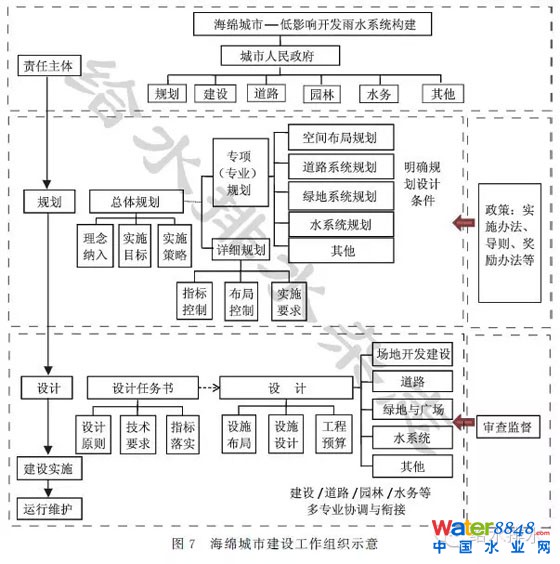 海綿城市建設(shè)必須要建立與之相適應(yīng)的管理體制(見圖7)。首先,海綿城市建設(shè)責(zé)任主體是城市人民政府,在現(xiàn)有的體制機(jī)制下要形成有為的組織協(xié)調(diào)和領(lǐng)導(dǎo)機(jī)制,明晰工作思路,制定工作方案和實(shí)施計(jì)劃,統(tǒng)籌部署,健全機(jī)制。其次,完善部門協(xié)調(diào)與聯(lián)動(dòng)機(jī)制,統(tǒng)籌城市規(guī)劃與建設(shè)管理,建立規(guī)劃、建設(shè)、市政、道路、園林、水務(wù)、水利等部門協(xié)調(diào)聯(lián)動(dòng)、密切配合的機(jī)制。此外,還要健全城市排水防澇和防洪管理體系、應(yīng)急機(jī)制,提升應(yīng)急防災(zāi)能力。