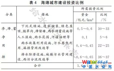 綜合各地已開展的低影響開發(fā)建設(shè)項(xiàng)目的實(shí)踐,估算海綿城市建設(shè)投資為1.6~1.8億元/km2,見表4。
