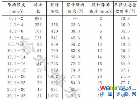 鑒于徑流系數(shù)指標(biāo)過于理論化,在實(shí)際應(yīng)用過程中不易操作。因此,通過將徑流系數(shù)的概念轉(zhuǎn)化為年徑流總量控制率,并通過年徑流總量控制率求得所對(duì)應(yīng)的設(shè)計(jì)雨強(qiáng)(mm/d),作為海綿城市建設(shè)的管控指標(biāo),以便于實(shí)際操作。