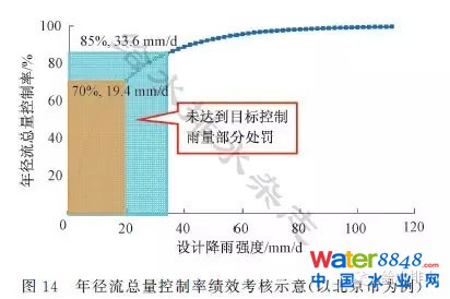 將年徑流總量控制率、水環(huán)境質(zhì)量狀況、排水防澇標(biāo)準(zhǔn)、污水再生利用及雨水利用、漏損控制等作為海綿城市建設(shè)的績(jī)效考核目標(biāo),考核結(jié)果可作為財(cái)政獎(jiǎng)補(bǔ)的依據(jù)。以年徑流總量控制率對(duì)應(yīng)的降雨強(qiáng)度作為地塊徑流控制是否達(dá)標(biāo)的衡量標(biāo)準(zhǔn),通過區(qū)域總排口的連續(xù)監(jiān)測(cè),對(duì)于未達(dá)到目標(biāo)控制雨量的部分進(jìn)行處罰(如圖14所示)。此外,不同考核地塊之間,也可研究建立年徑流控制量的平衡和交易機(jī)制,鼓勵(lì)公平分擔(dān)、獎(jiǎng)優(yōu)罰劣。
