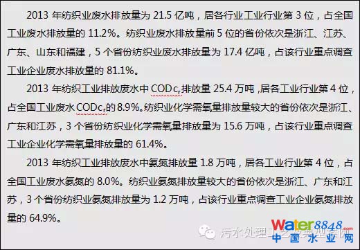 2008年紡織工業(yè)廢水排放量23億噸,居各行業(yè)工業(yè)行業(yè)第3位,占全國(guó)工業(yè)廢水排放量的10.60%。紡織工業(yè)排放廢水中CODcr排放量31.4萬噸,居各工業(yè)行業(yè)第4位,占全國(guó)工業(yè)廢水CODcr的7.76%。