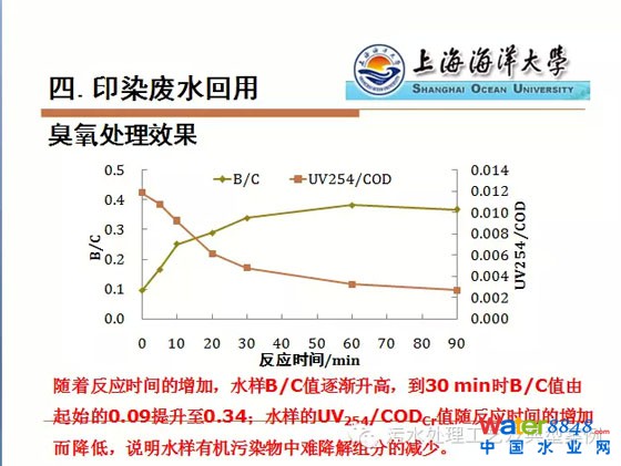 研究了B/C和UV254/COD,從圖中可看出,隨反應(yīng)時(shí)間增加,B/C值逐漸升高,到30min時(shí)B/C值由起始的0.09提升至0.34,水樣的UV254/COD值隨反應(yīng)時(shí)間增加而降低,UV254代表水中難降解組分,說明隨時(shí)間增加,水中難降解有機(jī)物減少很多。