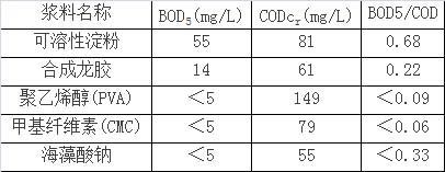 漿料目前常用的是這五種,最常用的兩種:聚乙烯醇和可溶性淀粉,聚乙烯醇的B/C特別低,實(shí)際情況可能0.01都不到,可生化性特別差。