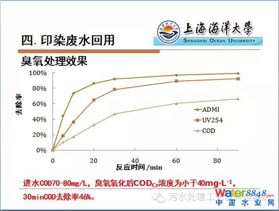 MBR出水COD為70-80mg/L,臭氧氧化后(30min)COD濃度基本小于40mg/L,COD去除率在40%多,這個(gè)去除率比較高,以前做垃圾滲濾液也沒有這么高。色度的去除率也很高,在10min左右有80%的去除率,到了30min基本上到90%多(看ADMI,那是美國(guó)表示色度的值)。