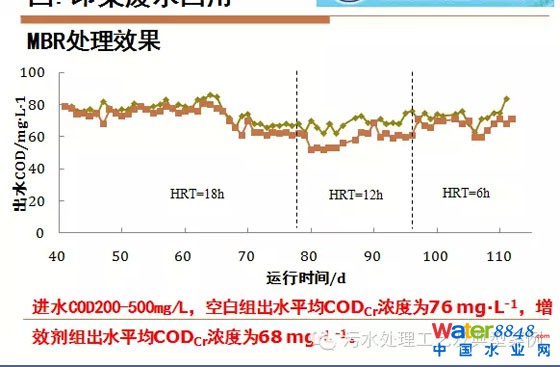 MBR分了兩組,一組傳統(tǒng)的MBR,一組加了自己做的增效劑,主要是抗污染,也對(duì)MBR處理效果有稍微提高。進(jìn)水COD200-500mg/L,空白組出水平均76mg/L,增效劑組出水平均68mg/L(做了100多天的試驗(yàn))。