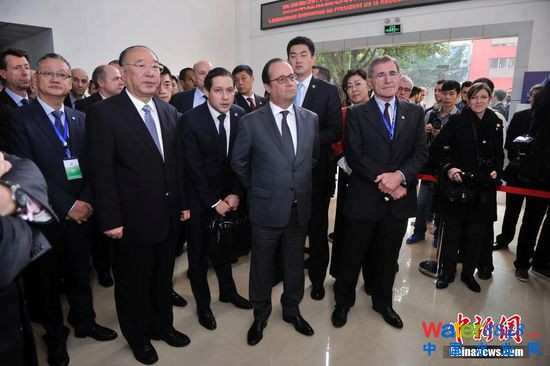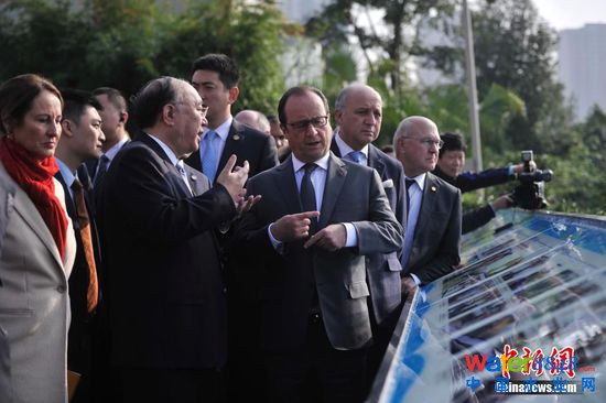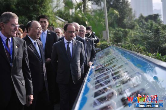 11月2日,法國總統(tǒng)弗朗索瓦·奧朗德專機抵達重慶開啟他對中國的第二次國事訪問。此次亦是奧朗德首次正式訪問重慶,并有官方代表團、文化界人士、企業(yè)家隨行。奧朗德在重慶市長黃奇帆的陪同下,先后參觀了重慶中法唐家沱污水處理廠和湖廣會館,了解重慶經(jīng)濟社會和文化發(fā)展情況。圖為重慶市長黃奇帆陪同奧朗德一行參觀重慶中法唐家沱污水處理廠。 中新社記者 陳超 攝