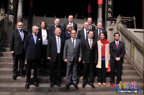 11月2日,法國總統(tǒng)弗朗索瓦·奧朗德專機抵達重慶開啟他對中國的第二次國事訪問。此次亦是奧朗德首次正式訪問重慶,并有官方代表團、文化界人士、企業(yè)家隨行。奧朗德在重慶市長黃奇帆的陪同下,先后參觀了重慶中法唐家沱污水處理廠和湖廣會館,了解重慶經(jīng)濟社會和文化發(fā)展情況。圖為中方代表與法國代表團部分成員在湖廣會館內合影留念。 中新社記者 陳超 攝