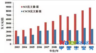 其次,高校功利評估價值觀的錯誤引導。目前國內(nèi)大學普遍對教師使用的科學評價指標包括研究經(jīng)費、國際SCI論文發(fā)表和SCI 雜志影響力,尤其是SCI 論文發(fā)表已成為教師職業(yè)發(fā)展、晉升的主要價值取向,這長期控制和影響著教師的學術活動,使教師熱衷于“申請課題、開展研究、發(fā)表SCI 論文(申請專利)、通過評審、再申請課題”的循環(huán)。一些年富力強的中年教師本應該將積累的科研成果產(chǎn)業(yè)化,而迫于評價指標的壓力,而不得不“武松拿起了繡花針”,舍棄對研究成果轉(zhuǎn)化的追求轉(zhuǎn)為追逐SCI 論文的發(fā)表。圖一是2003-2013 年國內(nèi)環(huán)境保護領域發(fā)表學術論文變化統(tǒng)計數(shù)據(jù),可以看出,環(huán)保領域近十年的國內(nèi)學術論文增長迅速,已成為國際環(huán)保領域一支重要的研究隊伍。