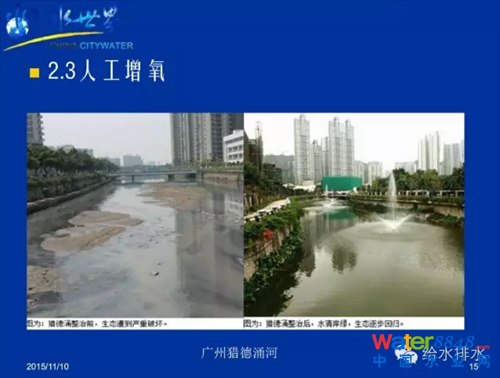 圖2是廣州的獵德涌河,在治理之前臭不可聞,污染非常嚴重,經(jīng)過人工增氧的方法進行治理,水變清了,黑臭消除了,又明顯改進了河道景觀,成為民眾喜愛的休息鍛煉場所。