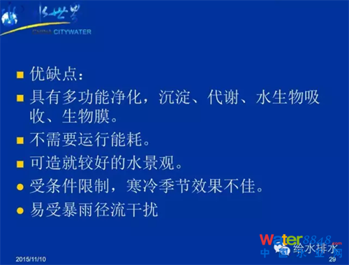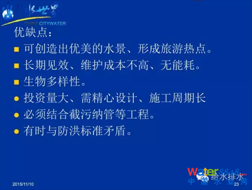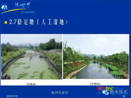 上圖為杭州孔家河,采用穩(wěn)定塘為主的系統(tǒng)治理方式,使其水質逐步變好。穩(wěn)定塘的優(yōu)點是具有多功能凈化、沉淀、代謝、水生物吸收、生物膜形成等作用,可以形成良好的水景觀,不產生運行能耗。缺點是受地理條件限制,寒冷季節(jié)效果不佳,容易受到暴雨等地表面源污染的干擾影響。利用海綿城市街道邊的小型濕地截污可以增強穩(wěn)定池功能 。