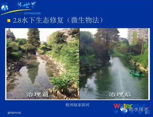 上圖為杭州的趙家濱河,治理前水體非常臭,采用水下生態(tài)修復(微生物法)治理后,水體清澈。