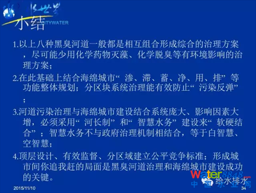 以上八種黑臭河道一般都是相互組合形成綜合的治理方案,盡可能少用化學藥物滅藻、化學脫臭等有環(huán)境影響的治理方案。在此基礎上結合海綿城市“滲、滯、蓄、凈、用、排”等功能整體規(guī)劃,并分雨水流向區(qū)塊系統(tǒng)治理就能夠有效防止“污染反彈”。河道污染治理與海綿城市建設結合系統(tǒng)龐大、影響因素大增,必須采用“河長制”和“智慧水務”建設來“軟硬結合”整體治理,智慧水務不與實際污水治理機制相結合,等于白智慧、空智慧。頂層設計,有效監(jiān)督,分區(qū)域建立公平競爭標準,形成城市間你追我趕的局面是黑臭河道治理和海綿城市協(xié)同治理成功的關鍵。
