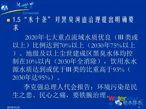 經(jīng)過三年的修編,國務院于今年4月正式發(fā)布《水污染防治行動計劃》 (簡稱“水十條”)。明確提出:2020年七大重點流域水質優(yōu)良(Ⅲ類或以上)比例達到70%以上(2030年75%以上)。地級及以上城市建成區(qū)黑臭水體均控制在10%以內(2030年全消除),飲用水水源水質達到或優(yōu)于Ⅲ類的比重高于93%(2030年達95%)。李克強總理也在今年人代會報告中明確指出:環(huán)境污染是民生之患、民心之痛,要鐵腕治理。