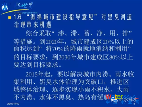 2015年起,要以解決城市內澇、雨水收集利用、黑臭水體治理為突破口,推進區(qū)域整體治理、逐步實現(xiàn)小雨不積水、大雨不內澇、水體不黑臭、熱島有緩解。